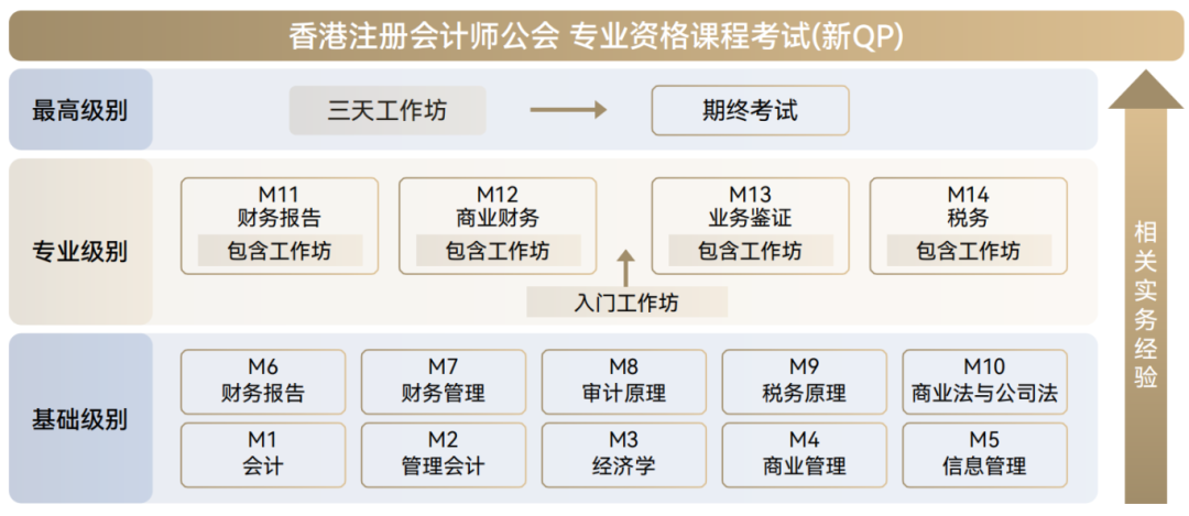 HKICPA专业资格课程包含三个渐进级别共计14个单元及一个最高级别综合考试。基础级别由10个单元构成,涵盖会计学、管理会计、商业经济、商业管理、信息管理、财务会计、财务管理、审计原理、税务原理以及商业法与公司法。专业级别包含4个单元,分别是财务汇报、商业财务、业务鉴证以及税务单元。最高级别为Capstone综合考试。每个级别均需通过相应的工作坊与考试来完成评核。具有相关学历或持有如CICPA、ACCA等其他资格证书的申请人,可根据评估结果豁免部分或全部基础级别单元。