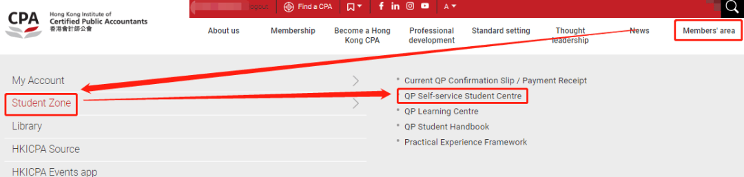 1、登陆官网(https://www.hkicpa.org.hk),点击Member’s Area→Student Zone→QP Self-service Student Center