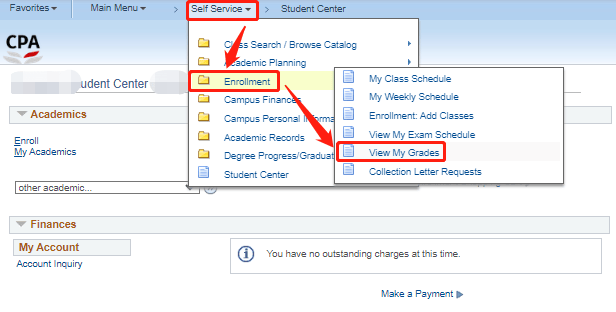2、进入个人中心页面,点击Self Service→Enrollment→View My Grades